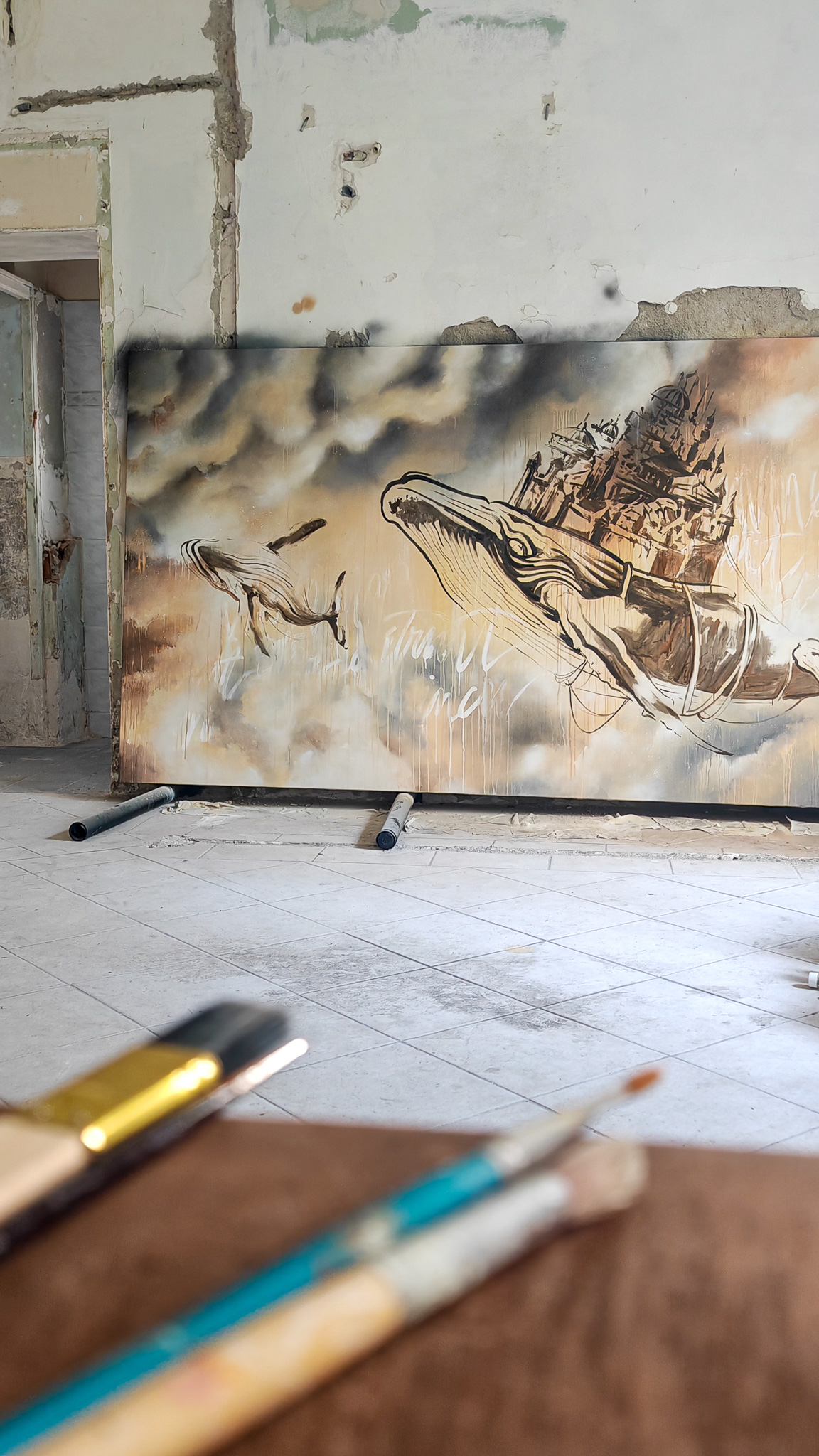 La culture japonaise influence aussi mon approche : ce tiraillement entre tradition et modernité m’inspire un travail centré sur le mouvement, le flow, où chaque création s’inscrit dans une énergie dynamique et vivante. J’aime que les choses se construisent instinctivement, dans un équilibre fluide et bouillonnant, comme si elles trouvaient naturellement leur place. Que ce soit sur une toile, un mur ou une peau, mon travail vise à créer des liens, révéler des récits et capter l’imperfection vibrante du moment.