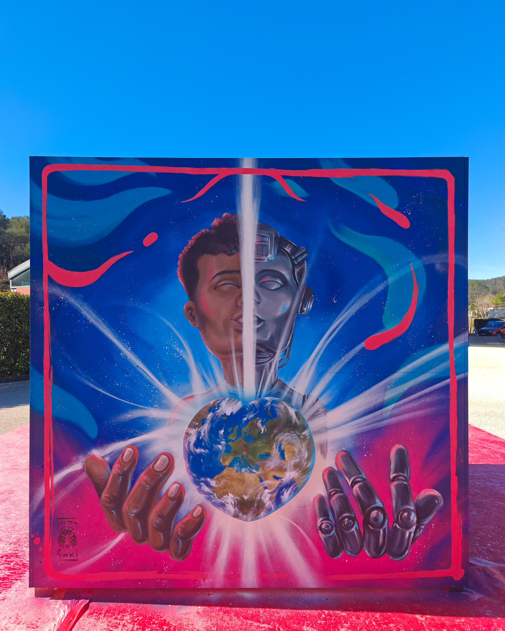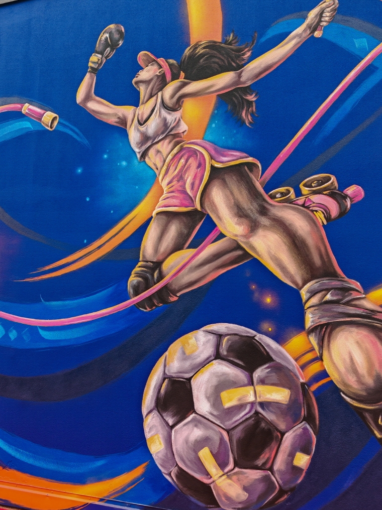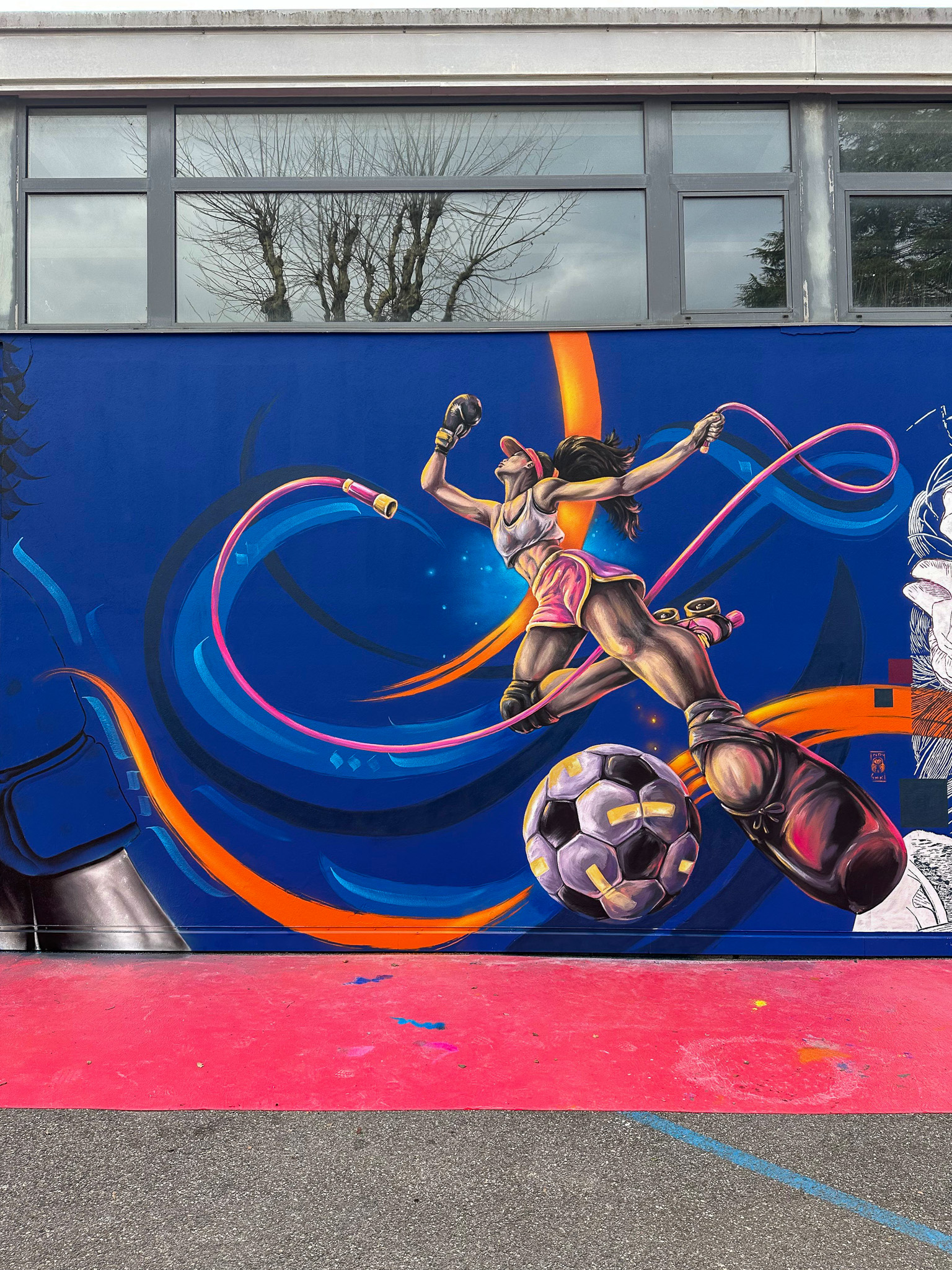 Mur extérieur du Gymnase Emilie Fer. Hauteur fresque : 4m